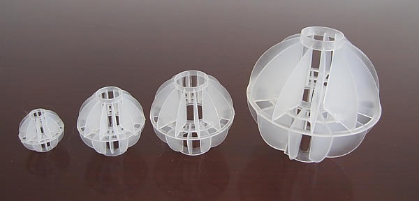 多面體中空球體主要是用塑料制成,減輕重量及耐化學(xué)腐蝕,不同使用場合可開發(fā)不同的球體。治金工業(yè)部首先從美國引進(jìn)作為廢氣處理的專用推廣材料,是由美國eller.Aj.1954年引進(jìn)的一種填料,由許多圓形圍繞結(jié)形成立體空間上的單水張力膜,由多個(gè)圓周組成的立體空間上的單水張力膜,由于球體中間的空隙中有較高的滯液量,從而增加了氣體與液體的接觸面積,延長了接觸時(shí)間,提高了處理效率和質(zhì)量,因此治金工業(yè)部首先從美國引進(jìn)作為廢氣處理的專用推廣材料。PVC材料為聚氯乙烯是高分子高密度聚合物,由于氯分子的官能團(tuán)見光易分解一般采用灰色,其余材料PP、PE、PVDF均為白色,PPS為耐化學(xué)腐蝕、耐高溫(達(dá)300C)材料,使用耐化學(xué)腐蝕、耐高溫(達(dá)300C)。